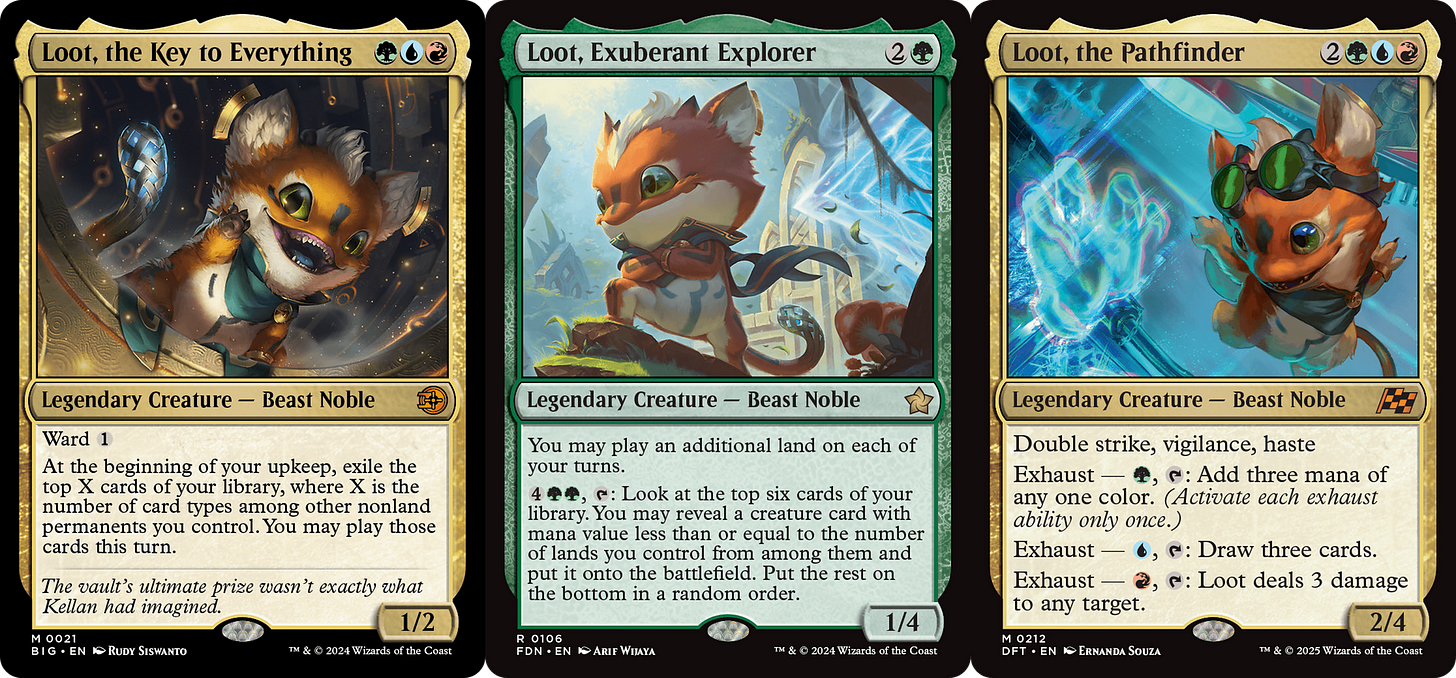 Loot embodies these new ideals. His visual design is that of a League of Legends character, he is quite literally a new character in the game's narrative, and he is being fostered within those stories by the old guard: Jace, Vraska, Chandra, and as of Tarkir: Dragonstorm Narset and Elspeth. The mechanics of the cards he features in further evidence his role in nu-Magic philosophy.