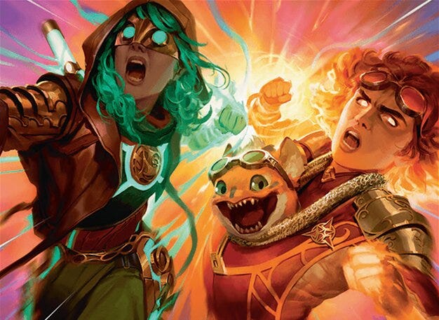 This excerpt from Alison Luhrs’ Outlaws of Thunder Junction | Epilogue 2: Bring the End, Part 2 tells us that Loot is intended to stand in for their biological child, and the couple fosters him as their own as a result. There's additional subtext here, of the older generation of characters raising and nurturing the new—a sort of passing of the torch. Chandra falls into a similar role in the Aetherdrift storyline, and appears carrying Loot much like a toddler in art for Full Throttle. While she and Spitfire strike at an unseen adversary tag-team style, Loot grins gleefully from within the pyromancer's jumpsuit. All the art lacks is an actual baby carrier to complete the look.