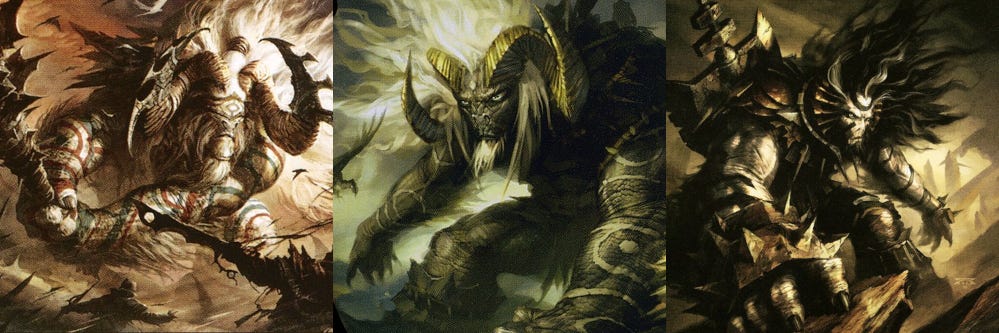 Raymond Swanland’s renderings of the Fomori boast gargantuan statures compared to Loot, appearing as kaiju-sized oxen rather than cute and cuddly, but his lineage is obvious. The horns and geometric patterns on their hides, combined with the context of his discovery by Jace and Vraska, mark him as the last child of a dead empire. He is an oxymoron, an ancient infant brought into the contemporary narrative, a character outside Magic's typical visual design but wholly of Magic, and his cards attempt to marry nostalgic, mythical cards with modern design. Too bad he didn't inherit nostrils from his ancestors.